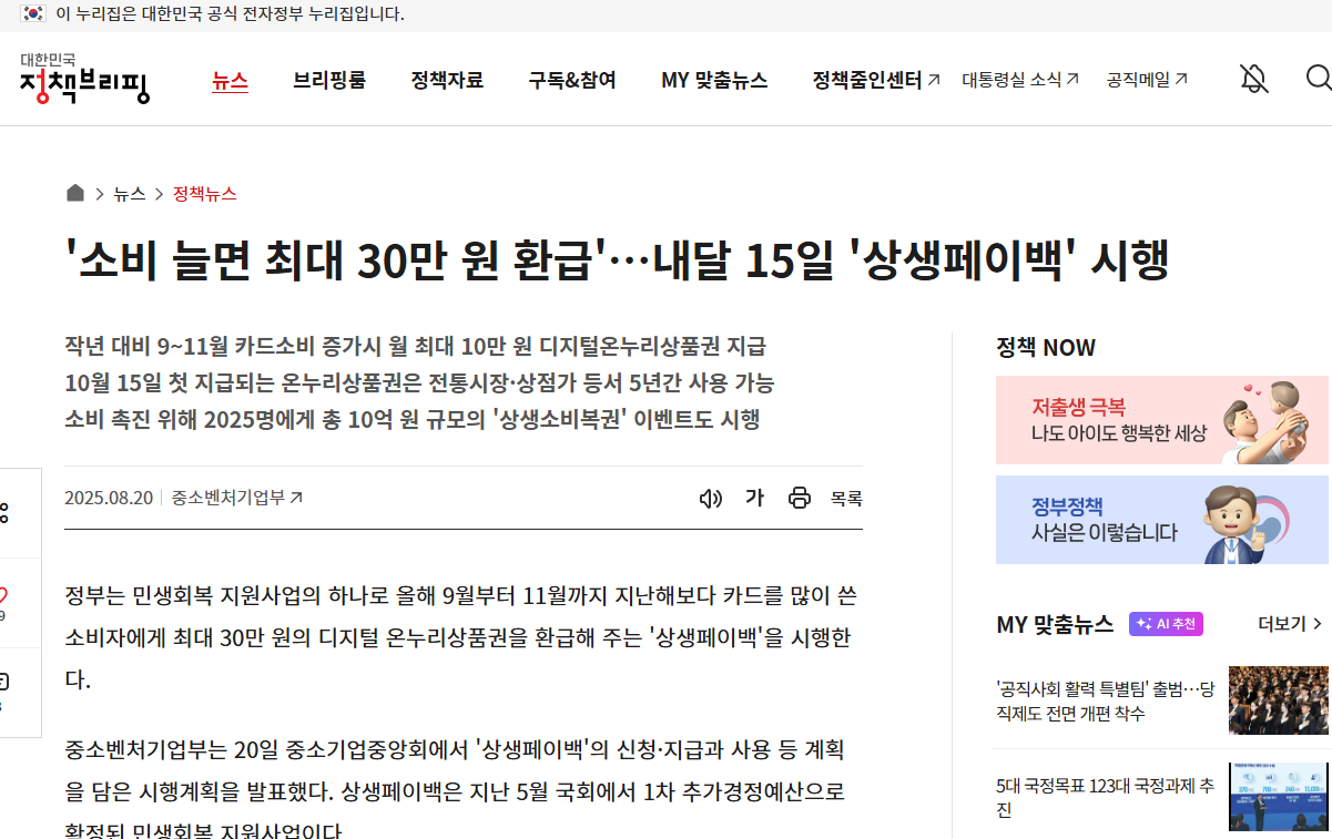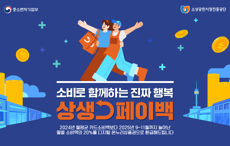 정부는 민생회복 지원사업의 하나로올해 9월부터 11월까지지난해보다 카드를 많이 쓴 소비자에게 최대 30만 원의 디지털 온누리상품권을 환급해 주는 '상생페이백'을 시행한다. 중소벤처 - 정책