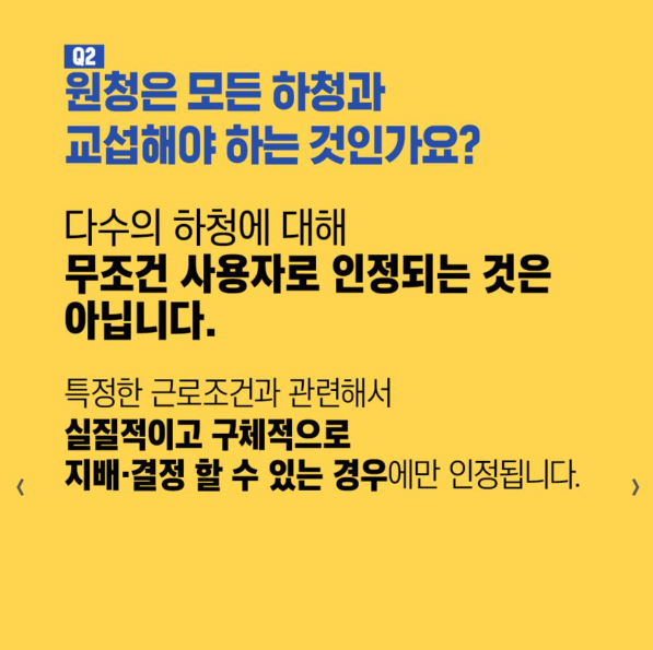 ‘사용자’ 개념이 하청업체 뿐 아니라, 하청노동자의 노동 조건에 실질적 영향력을 행사하는 원청까지 포함됨. - 단체교섭 대상 확대